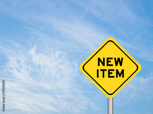 Naklejka premium Yellow transportation sign with word new item on blue color sky background