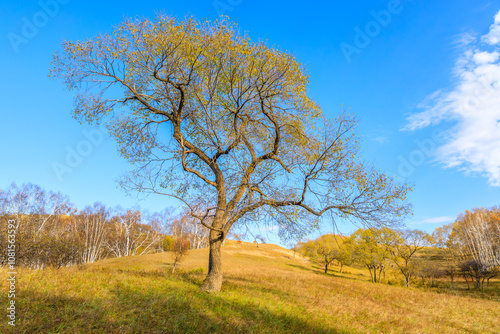 Fototapeta premium Yellow tree in autumn. Beautiful grassland pasture nature landscape in Inner Mongolia, China.