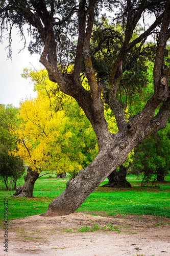 Naklejka premium YELLOW TREES AND LEAVES IN AUTUMN IN MADRID FOREST. AUTUMN NATURE
