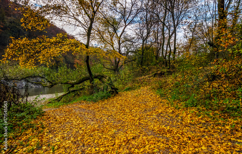 © Pellinni, Naklejka premium yellow trees on rocky shore of the river