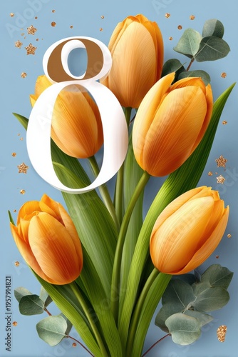 © Georgii, Obraz premium Yellow tulip bouquet with decorative number eight on blue background for spring celebration
