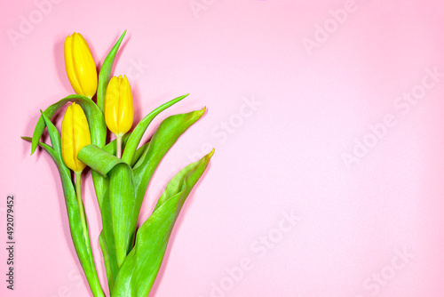 Fototapeta premium Yellow tulips on a pink background.