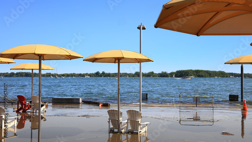 © SNEHIT PHOTO, Obraz premium Yellow umbrellas and plastic chairs on Sugar Beach during flood in Toronto.