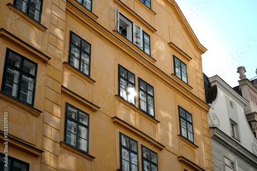 Naklejka premium Yellow urban facade with rhythmic windows and one open shutter. Glass reflects daylight softly. Elegant symmetry and warm color highlight traditional European style.