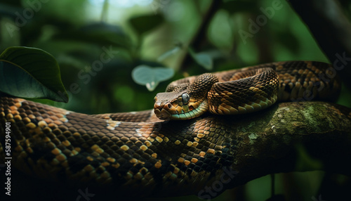 © Jeronimo Ramos, Naklejka premium Yellow viper spirals up branch, danger close generated by AI