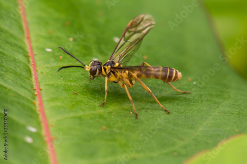 © alenthien, Fototapeta premium Yellow wasp on a green leaf (selective Focus)