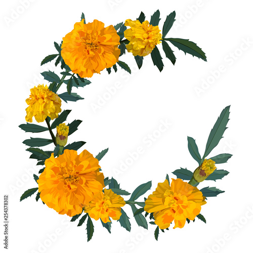 Obraz premium Yellow with orange flower marigold. Wreath. Vector illustration. Isolated on a white background.