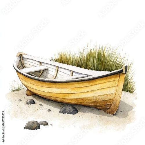 © Pixel Sculptor, Naklejka premium Yellow wooden boat on sandy shore