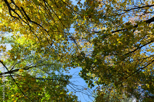 Obraz premium yellowed maple foliage on trees in the autumn season
