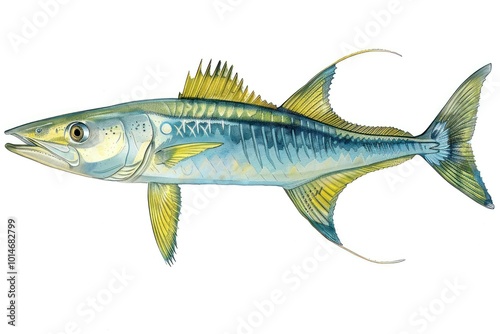 © Phuwadon, Fototapeta premium Yellowfin barracuda under the sea on a white background