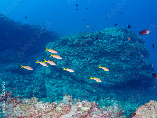 Fototapeta premium 美しいアカヒメジ、ホウライヒメジ(ヒメジ科)、オヤビッチャ(スズメダイ科)他の群れ。日本国静岡県伊豆半島賀茂郡南伊豆町中木から渡し船で渡るヒリゾ浜にて。 2022年夏水中撮影。Yellowfin goatfish (Mulloidichthys vanicolensis), Sergeant Major (Abudefduf vaigiensis), Whitesaddle goatfis