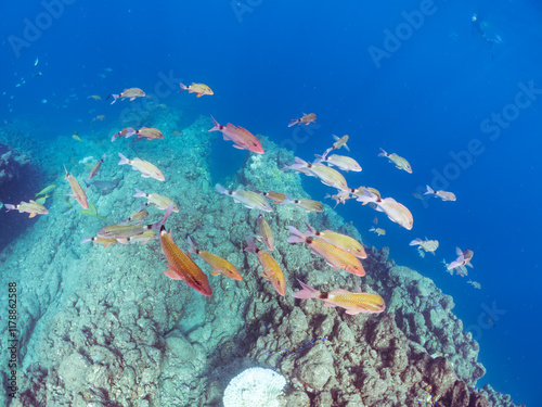 Fototapeta premium 美しいアカヒメジ、ホウライヒメジ(ヒメジ科)他の群れ。水面にはスキンダイバーも泳いでいる。英名学名:Yellowfin goatfish...