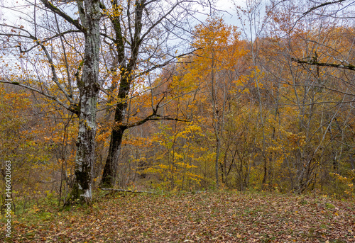 Fototapeta premium yellowing forest, the beginning of the autumn period in nature, views of the...