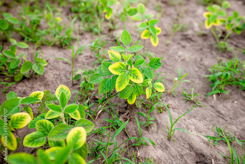 © Maryna, Obraz premium Yellowing young soybean sprouts in a farm field in the spring.