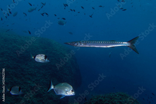 © André LABETAA, Fototapeta premium Yellowmouth barracuda or yellow barracuda (Sphyraena viridensis) in Mediterranean Sea