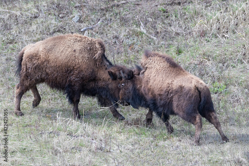 Fototapeta premium Yellowstone National Park. Two young bison playing fight.