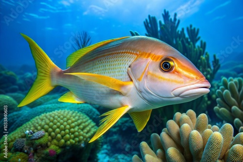 Naklejka premium Yellowtail snapper swimming through colorful coral reef