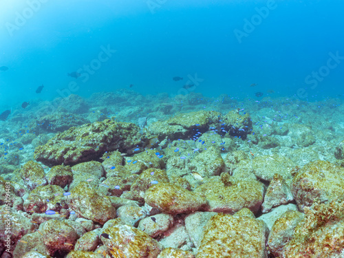 © d3_plus, Fototapeta premium 美しいツユベラ(ベラ科)の幼魚とソラスズメダイ(スズメダイ科)、ニシキベラ他の群れ。 英名学名:Yellowtail wrasse, Coris gaimard Heavenly Damselfish (Pomacentrus coelestis) Cupid wrasse, Thalassoma cupido 静岡県伊豆半島賀茂郡南伊豆町中木ヒリゾ浜2024年