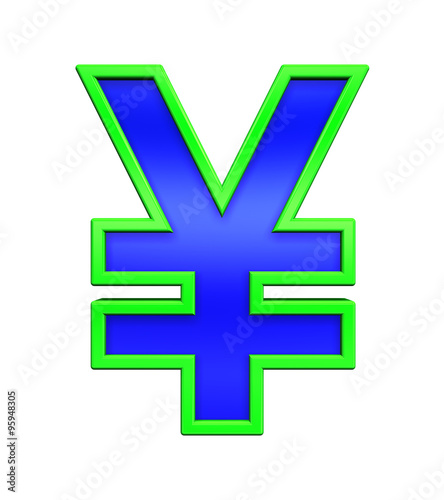 © Piotr Pawinski, Obraz premium Yen sign from blue glass with green frame alphabet set, isolated on white. Computer generated 3D photo rendering.