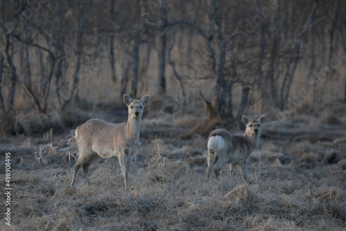 Fototapeta premium Yezo deer in Kushiro Wetland looking straight ahead in the early morning in...