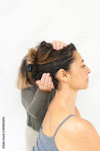 © Guillermo Angulo, Naklejka premium Yoga and alternative therapies teacher, positioning a student in the head position.
