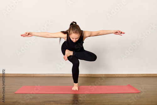 Fototapeta premium Yoga balance pose on red mat in minimalist room