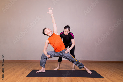 © ThamKC, Fototapeta premium Yoga instructor guiding student perform extended side angle pose