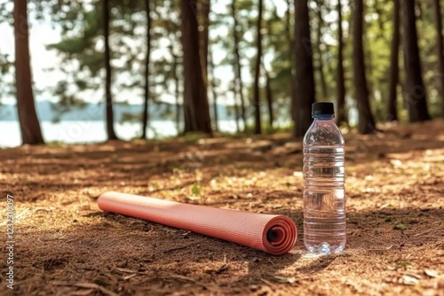 Naklejka premium Yoga Mat and Water Bottle in a Forest Setting