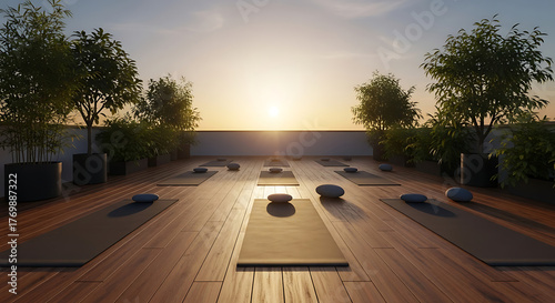 Obraz premium Yoga mats and meditation stones on a wooden rooftop terrace at sunset with potted trees and plants around