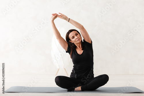 Fototapeta premium Yoga meditation at home. Beautiful young woman working out