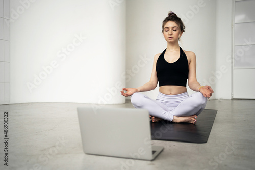 © muse studio, Naklejka premium Yoga trainer online laptop workout woman doing asana exercise on mat. Healthy lifestyle concept