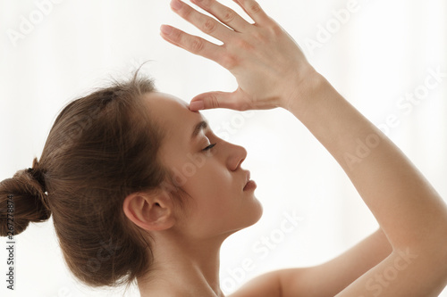 © Prostock-studio, Naklejka premium Yogi Woman Doing Meditation Exercise, Namaste Hands To Forehead