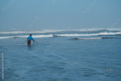 © Ma'ruf, Naklejka premium Yogyakarta, Indonesia-July 3, 2022: A lone fisherman pulling a net in the shallow ocean waters at the beach, under a vast sky, depicting traditional livelihood.