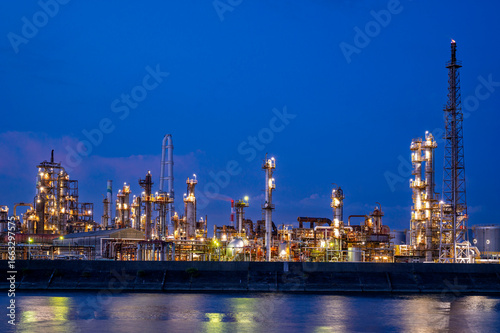 Naklejka premium Yokkaichi industrial Japan factory area with blue twilight sunset sky background view Yokkaichi, Mie Prefecture, Japan.