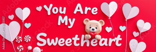 © Yury, Obraz premium You Are My Sweetheart with Cute Bear Holding Heart on Red Background Conveying Love and Affection for Valentine's Day