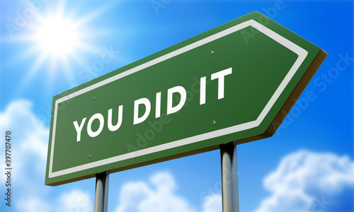 © photon_photo, Obraz premium You Did It Green Road Sign Against Clouds and Sunburst.