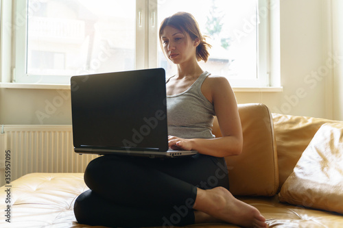 © Miljan Živković, Fototapeta premium Young adult caucasian woman working on the laptop computer from home sitting on the sofa bed in day taping online female freelancer or shopping online efficiency and expertise making money concept