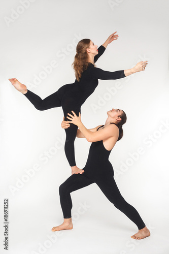 © khosrork, Obraz premium Young adult couple doing acroyoga pose for practicing in balance.