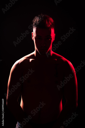 © Jorge Argazkiak, Fototapeta premium Young adult illuminated by red and white lights with a black background.