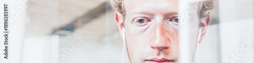 © Ryzhkov, Fototapeta premium Young Adult Programmer Looking at Screen While Updating Software and Installing Firmware for Cyber Security Development with Copy Space for Tech Background