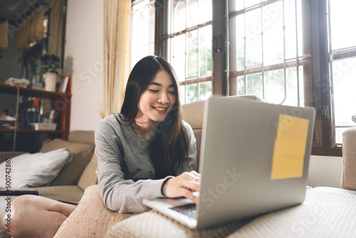 © dodotone, Naklejka premium Young adult southeast asian woman stay and working at home using laptop computer on sofa