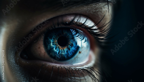 Fototapeta premium Young adult with blue eyes staring at camera, close up portrait generated by AI