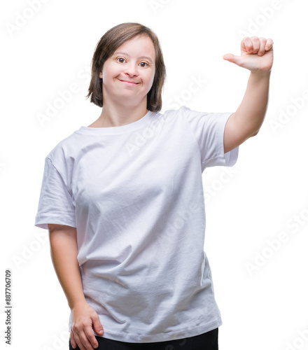 Fototapeta premium Young adult woman with down syndrome over isolated background showing and...