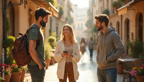 Obraz premium Young Adults Engaged in Conversation on a Charming European Street.