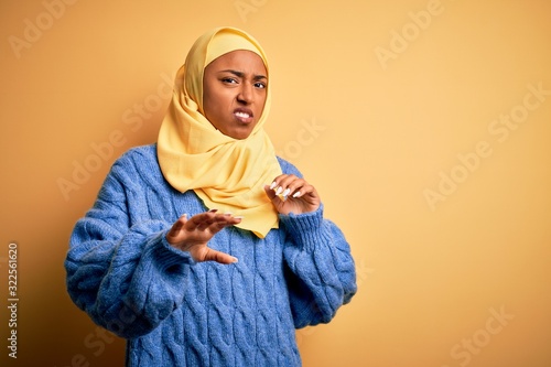Obraz premium Young African American afro woman wearing muslim hijab over isolated yellow background disgusted expression, displeased and fearful doing disgust face because aversion reaction. With hands raised