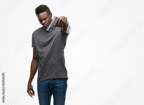 Fototapeta premium Young african american man holding a gun with a confident expression on smart...