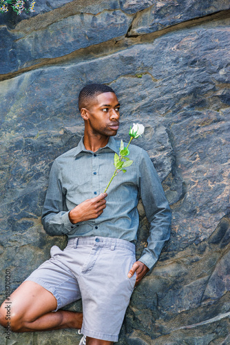 © Alexander Image, Naklejka premium Young African American Man missing you and waiting for you. Young black man wearing gray shirt, shorts, standing against rocky wall at Central Park in New York, holding white rose, looking around..