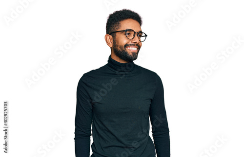 Fototapeta premium Young african american man wearing casual clothes looking away to side with smile on face, natural expression. laughing confident.