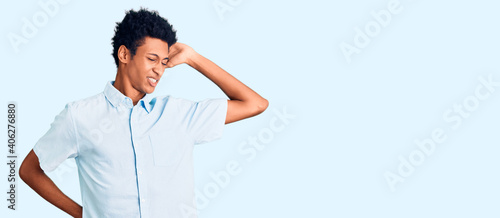 Obraz premium Young african american man wearing casual clothes stretching back, tired and...