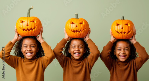 © tatsiana502, Fototapeta premium Young African American triplets with curly hair, happily holding jack-o-lanterns on their heads and smiling for Halloween